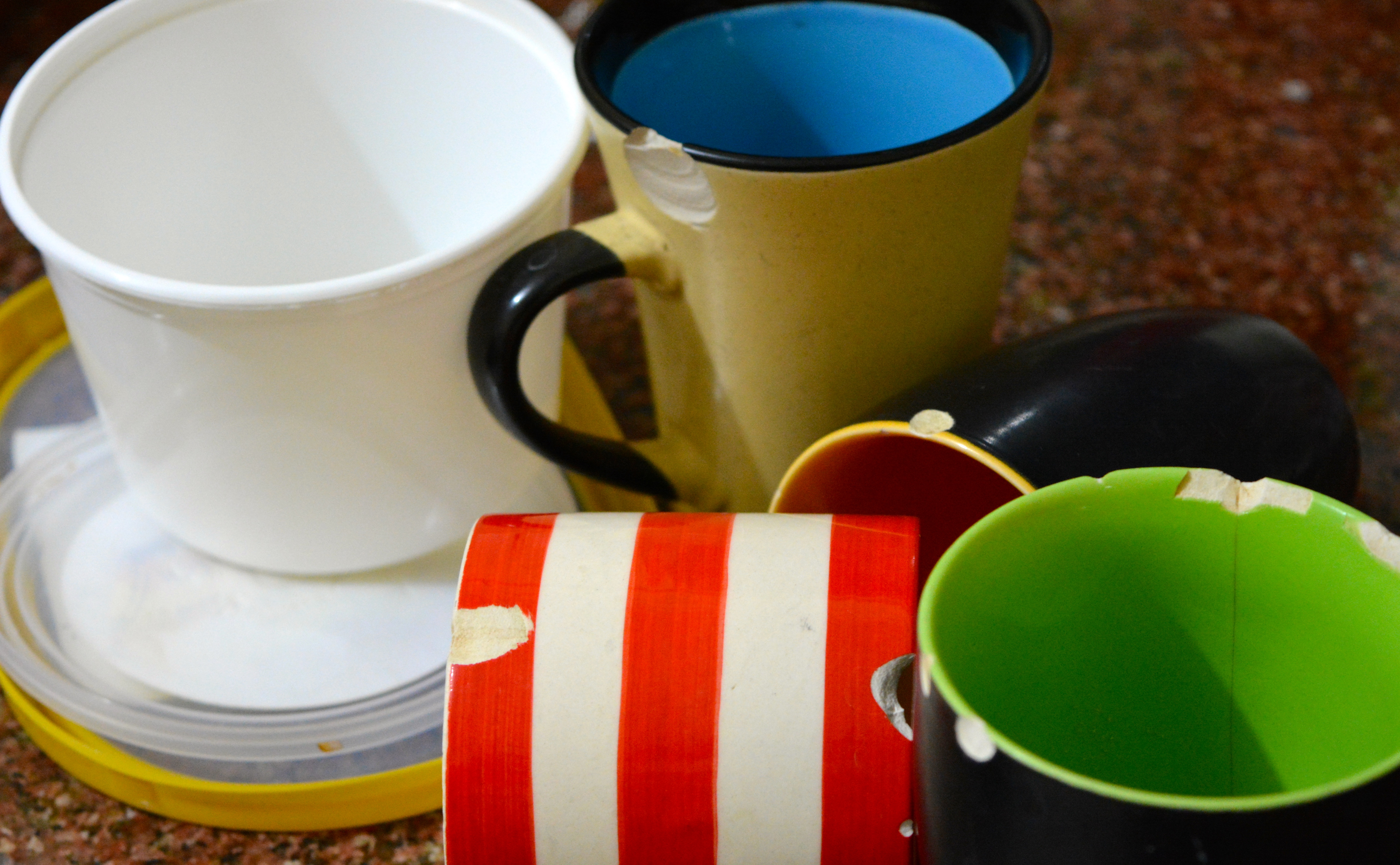 Broken mugs I retained for days the domestic help didn’t turn up to do the dishes and I needed coffee, Tupperware that is unusable, plastic cups and spoons.